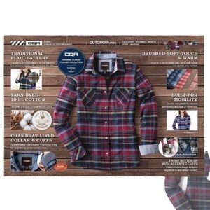 New With Tags CQR WOMEN'S 100% BRUSHED SOFT COTTON PLAID FLANNEL SHIRT, Color is Very Berry, Quintessential cool-weather chambray lining for long-lasting contemporary wear, Classic button design for quick adjustments and added comfort, Double rear pleats for fullness functionality and ease of movement,