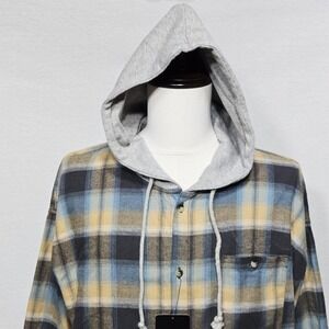 CQR Shirt Mens Large Blue Yellow Plaid Hooded Flannel Button Up Casual Jacket