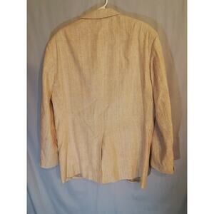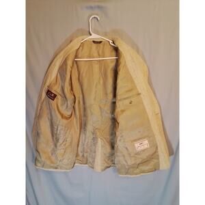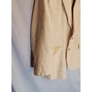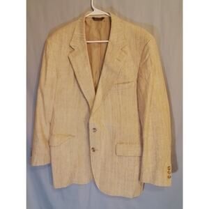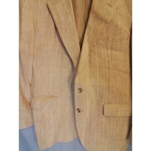 C&R Clothiers Silk Blend Sports Coat / Jacket. Textured tan and fully lined. Pockets on inside and outside. Size 44. 22" pit-to-pit and 31" long.