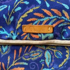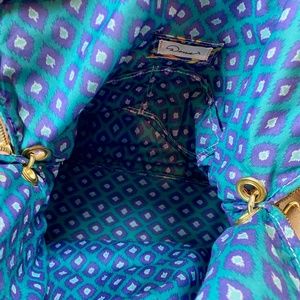 Stylish wide tote without being too bulky. Folded purse measures 15.5" x 10.5" x 5", opens to 15.5" x 15.5". 2 exterior zippered pockets, segmented interior pockets. 2-way zippered top opening with leather tassel accents keeps contents secure and allows you to expand when you need the room or fold over for a more compact carryall. 1-1/2-inch wide adjustable webbed shoulder strap. Flaws: Strap shows wear. Pink dye on right side. See photos 6-7. Blends into pattern though. Priced accordingly