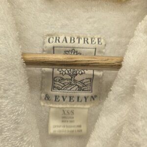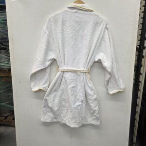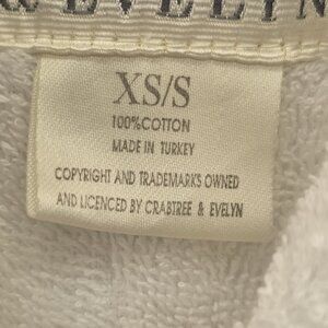 This Crabtree & Evelyn belted cotton robe in size XS/S features embroidered flowers, a midi length, 3/4 sleeves, a collared neckline, and a tie closure. The white robe is machine washable and made of high-quality cotton, making it suitable for any season. With a classic design accented by the brand's logo, this robe is perfect for women looking for a comfortable and stylish sleepwear option. Made in Türkiye, this robe combines nature themes with a kimono style for a versatile and elegant piece.