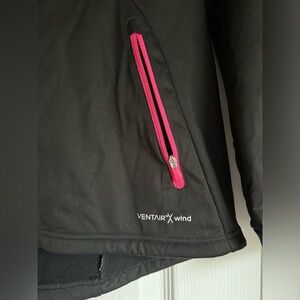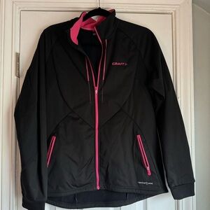 Craft duable soft shell zip up jacket for women. Size large, black jacket with pink accents on the zippers and collar. The jacket features a center zip and two side pockets with zip closures. Interior on waist has cinches for a fitted and windproof fit. Great jacket for winter sports like cross country skiing, running, and fat biking. In excellent condition, worn only a handful of times.