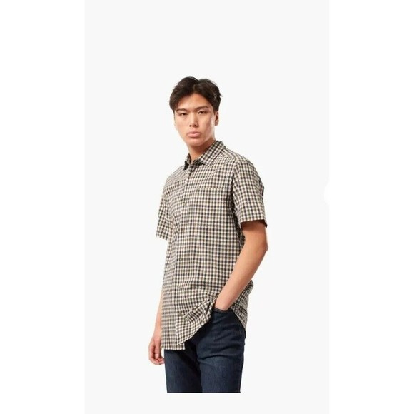 Men's short-sleeve summer check shirt made with cotton polyester yarn meeting the Better Cotton Initiative standards (BCI). This short sleeve, cooling summer button-up everyday adventure shirt has 2 pockets, drying loops, and lightweight fabric.