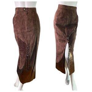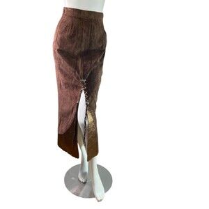 This is a vintage Crain western couture style skirt, a long midi pencil style with a front slit with lacing. Labeled as a size 6/8. This is a vintage skirt so the sizing is closer to a size XS. This skirt is brown suede with a bottom section of gold metallic leather. Handmade concho buttons. Front slit with conchos and lacing. Measurements;