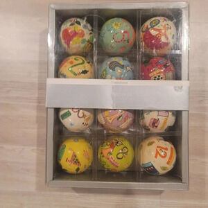Celebrate the holiday season with this beautiful set of twelve Christmas ornaments from Crate & Barrel. The round, medium-sized ornaments feature a multi-design pattern in vibrant colors and are made of paper mache material. Each ornament has a clear loop for easy hanging and the set includes a total of twelve ornaments.
