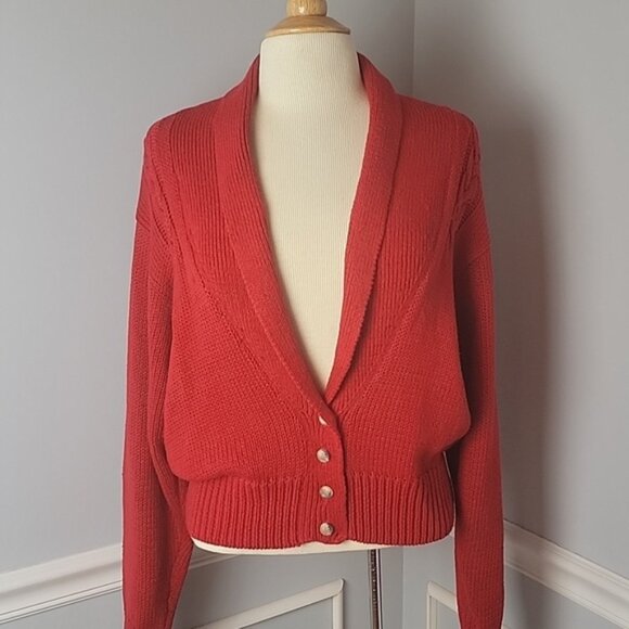 CRAZY HORSE Red Grandpa Collared Deep V-Neck Knit Button Cardigan Sweater L VTG