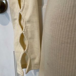 Such a cute dress! I wore it just one time for an art show I had. Pics of me wearing included, I layered it over another dress. It is sooo elegant and eye catching. Small slits at the bottom as well. For reference, I am 5’ tall.