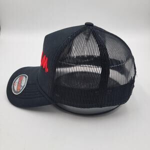 Main colors: black with vibrant red text and white accent embroidery. Classic hip-hop inspired design in a modern trucker style.