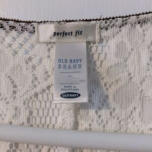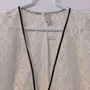 This lace cardigan is the perfect cream color with brown accent. The brown accent is down the front of the v-neck and then at the tie at the waist. The waist does have a cinch at the waist.