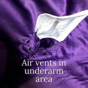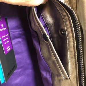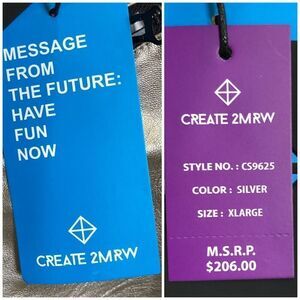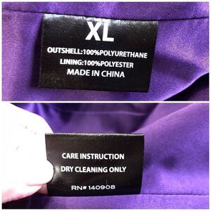 This jacket is fire! 🔥 Not only is it super cool, but it's made so incredibly well and with so many details. This is CREATE 2MRW's 82 C'est La Vie Silver Faux Leather Biker Jacket in men's size XL. This faux leather biker jacket has a 2-snap button-closure collar strap, 3 zippered pockets in the front, inside chest pocket with snap closure and elbow patches. Cool pleated detail on shoulders and back, quilted hem on back. It's a full-zip jacket with vibrant purple sateen lining (100% polyester). #82 on left front chest. Zippered detail on the sleeves. "C'est La Fu3king Vie" (such is life or that's life) in large abstract letters on the back. The pit-to-pit measurement is 24", the length is 28" and the sleeves are 27". MSRP $206. Dry clean only on this awesome jacket!