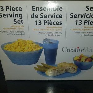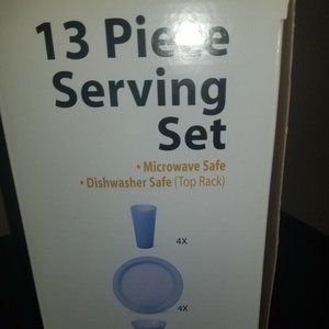 13 Piece service set contains 4 plates, 4 tumblers, 4 small bowls and 1 large serving bowl, Great for starter or outdoor use. Plastic pieces re Microwave safe and top rack dishwasher safe. New... never opened. Opaque white color.