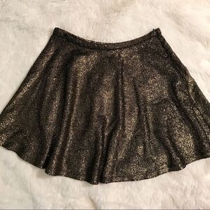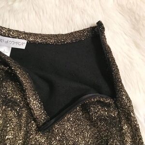 Gold and black metallic mini skirt with textured accents throughout and zip closure at hip