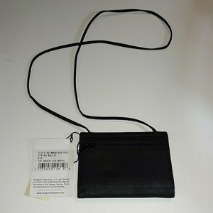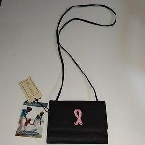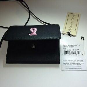 Full grain tumbled leather in black with embroidered Pink Ribbon in honor of breast cancer awareness. Trifold wallet with four credit card slots and one ID slot. Open slot for paper money and a zipper pocket in the back for change. Has snap flap closure. 19" strap drop. New with tags. From a smoke free home.