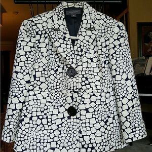 🌷🌷Abstract print 2 button jacket superbly made. Pair w/ white or navy skirt/slacks to go stepping out.The buttons snap closed for a secure fit. The sleeves have a split wide cuff which I love. Only worn a few times. 💥💥EUC.🌷🌷