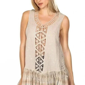This crochet detail tunic top, fringe and irregular plaid hemline. pair with jeans and heels or denim shorts with sandals, you could even wear it over your bikini to the beach!