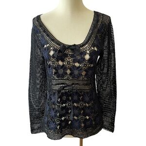 CROCHET TOP FITS M BLACK BLUE FLORAL FAIRY GOTH WITCHY SHEER BOHEMIAN LACE CHIC