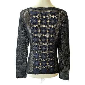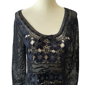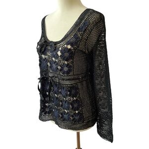 No brand, size or fabric tags - black crochet with navy blue floral pattern, fits a size Medium, sweet ribbons at neckline and waist, long sleeves, sheer.