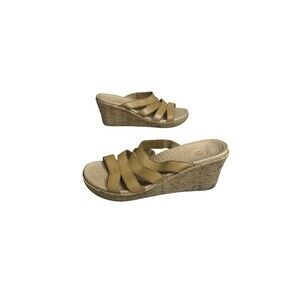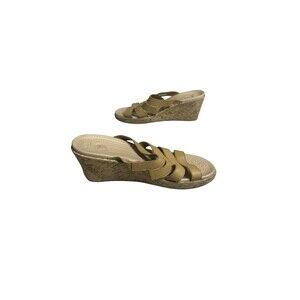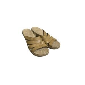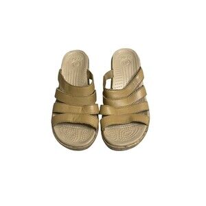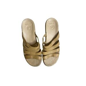CROCS A Leigh Slip On Leather Tan Camel Brown Strappy Cork Wedge Sandals size 7