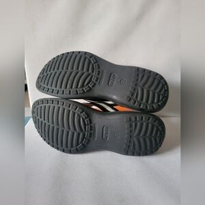 Crocs black flip flops/sandals (sz 10). The sandals have a fabric stripe down the center of the straps. The sandals are in very good condition. Please see all pictures.