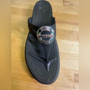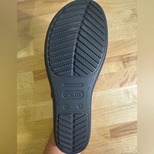 Comfortable black Crocs flip-flops. Features silver details on straps. Ideal for everyday wear.