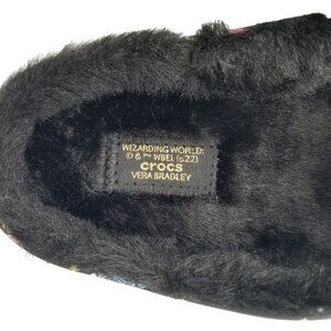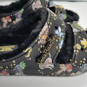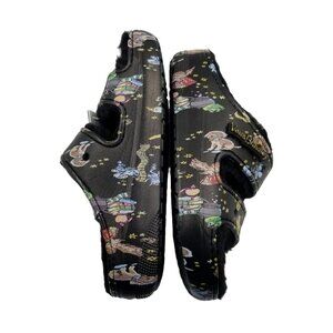 Stylish black sandals with vibrant graphic design. Soft furry lining for comfort. Perfect for everyday wear.