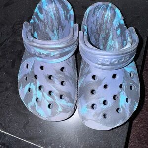 Eye-catching Crocs with a black and blue swirl design. Perfect for casual wear.