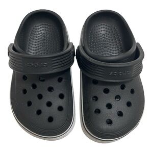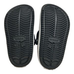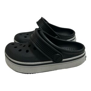 Step into comfort with these CROCS Black and White Slippers, featuring a sleek platform design. The solid black upper is adorned with classic ventilation holes for breathability, while the contrasting white midsole adds a modern touch. Enjoy the convenience of a backless slip-on style, perfect for casual wear. Experience the iconic CROCS comfort with a fashionable twist.