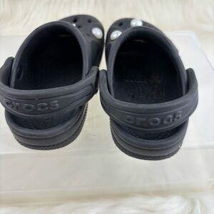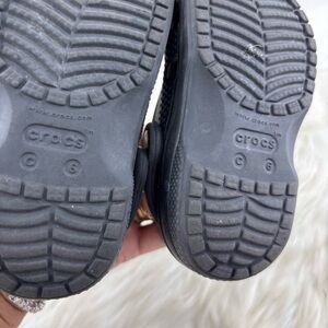 These CROCS water shoes feature a sleek black design adorned with charming white daisy accents, perfect for water activities. Crafted from durable, lightweight material, they offer excellent breathability with their signature ventilation holes and a sturdy sole for comfort. Ideal for both casual wear and aquatic adventures, these shoes seamlessly blend style and practicality.