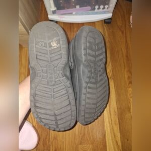 Stylish charcoal clogs with perforated top. Easy slip-on design. Ideal for casual wear.