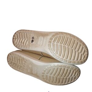 These Crocs shoes feature a fun Mickey Mouse design in beige. Perfect for Disney fans, they offer comfort and style.