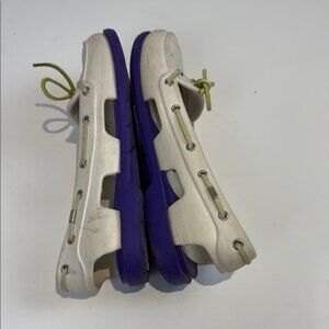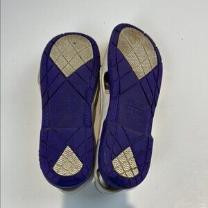 These CROCS flats feature a cream upper with a striking purple sole, offering a chic and modern look. The slip-on design is enhanced by a decorative bow, adding a playful touch to these comfortable loafers. Perfect for casual outings, these shoes combine style and ease effortlessly.
