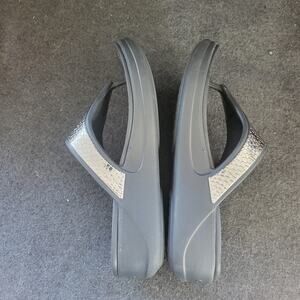 The CROCS Dual Comfort Monterey Metallic Wedge Sandal in Navy Blue Animal Print is a stylish and comfortable slip-on sandal perfect for casual occasions and parties. With a mid-height wedge heel and a cushioned footbed, these sandals provide all-day comfort and support. The synthetic outsole and lining material ensure durability and quick drying, while the breathable and odor-resistant features make them ideal for summer, fall, and spring wear. The thong style and synthetic upper material give these sandals a trendy look, and the non-marking sole adds practicality to the design. Made by Crocs, these sandals are a must-have for any fashion-forward woman.