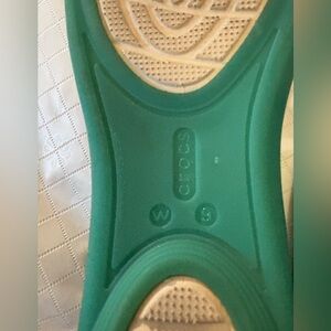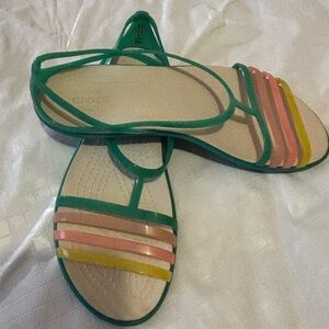 Stylish CROCS sandals with green straps. Features multicolor accents in pink, yellow, and cream. Comfortable and versatile.