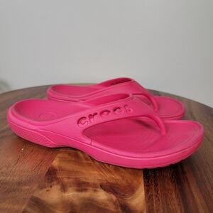 Bright pink Crocs sandals. Perfect for casual wear. Flip flops style slip on shoes with toe post. Crocs spellout on strap.