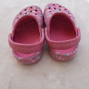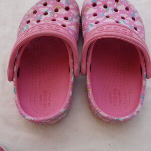Adorable pink CROCS with a fun rainbow and cloud pattern. Perfect for kids.