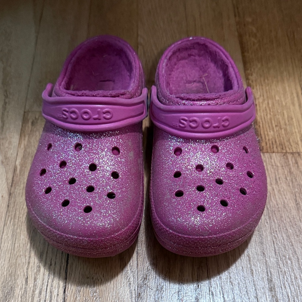 Bright pink clogs with glitter finish. Comfortable and fun for kids.