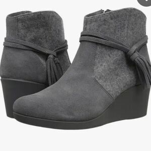 Beautiful wedge silhouette Suede and fabric uppers Tassle embellishments 2.3 inch heel height Dual Crocs Comfort: deep cushion with all day support Material: Synthetic Occasion: Casual Collection Name: Leigh Sole Material Outer: Synthetic Product Type: Heel Boots Toe Shape: Round Toeb2.3 Inch Product Pattern: Solid/Plain