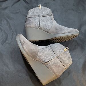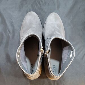 CROCS LEIGH SUEDE MIX BOOTIE ZIPPER CLOSURE WOMEN'S WEDGE BOOT SIZE W11 COLOR SLAY GRAY. It's a shoe. It's a bootie. It's an elegant mash-up worthy of any woman's wardrobe! The Leigh's refined, feminine shape pairs beautifully with a lot of different looks. Inside, there's a soft foam footbed on top of a shock-absorbing wedge and rubber outsole for all-day comfort. Plus, the wedge heel gives you the lift you want without taking you out of your comfort zone.Women's Crocs Leigh Suede Mix Bootie Details: