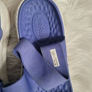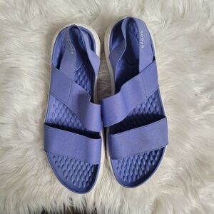CROCS LiteRide sandals with stretch straps in purple-gray, womens size 10.