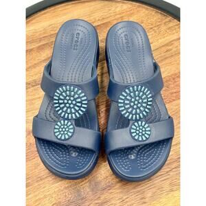 CROCS Monterey Diamante Wedge Women's 5 Navy Blue Slides Open Toe Shoes