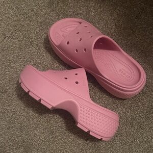 Vibrant pink platform clogs by CROCS. Comfortable and trendy.