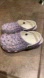 Violet, purple, iridescent, glitter, geometric, classic clog, slip-on shoe by CROCS in unisex, child size J1. Soles have signs of wear with some loss of tread on the heel of one shoe. Croc hing logos have scuffs which is common. Some color loss as shown in photos. Pre-owned with some signs of wear from normal use.
