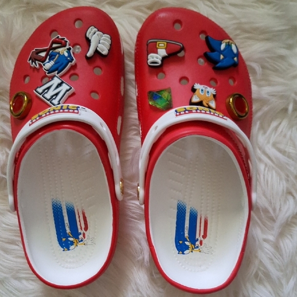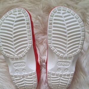 These CROCS sandals feature a vibrant red and white color scheme, perfect for casual outings. The perforated design ensures breathability, while the rounded toe offers comfort. Ideal for those seeking a blend of style and functionality in their footwear. These are in excellent condition and can be worn by adults. I wear size 7 and they fit perfect.