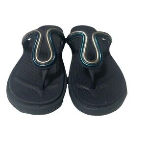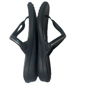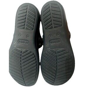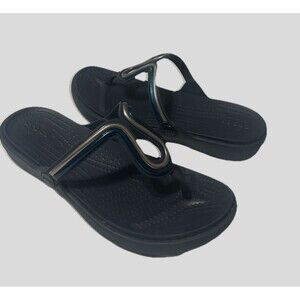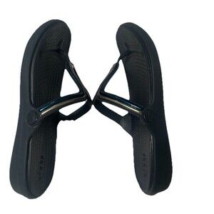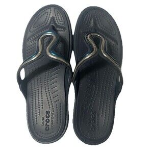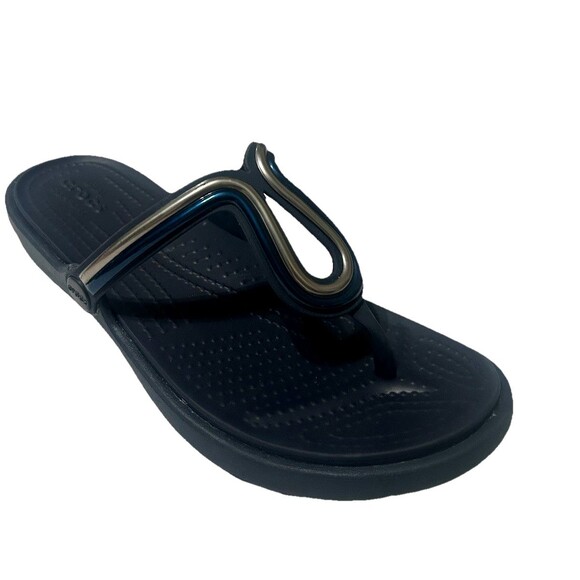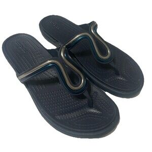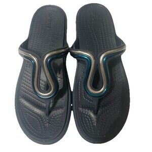 CROCS Sanrah Women's 8 Gray Black Navy Blue Silver Metal Block Slide Flip Flop Sandal