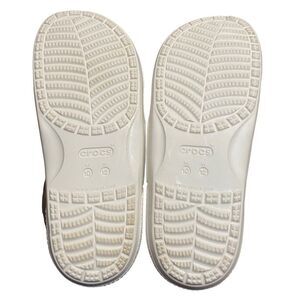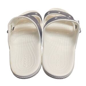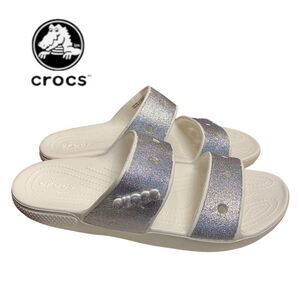 Step into comfort with these CROCS sandals, showcasing a sleek silver and white design. The sandals feature a chunky sole and a perforated upper for enhanced breathability. Made from durable Croslite material, they ensure a lightweight and comfortable fit for everyday wear.