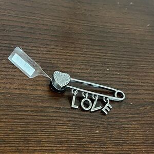 Stylish silver tone brooch looking jibbitz with 'LOVE' charms and heart detail. Perfect accessory for any crocs shoes