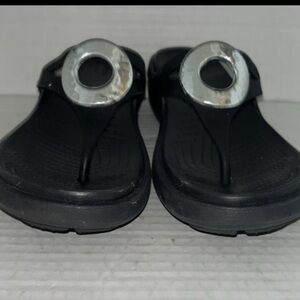CROCS Womens Sanrah Silver Ring Wedge Sandals Black Size 6 slip on pre-owned good condition no holes minor wear very clean