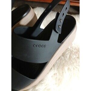 The CROCS Women's Size 6 Brooklyn Low Wedge Sandals feature a low wedge heel with a pushpin closure, making on and off a cinch. The black and tan color with the logo accents adds a trendy touch to these versatile sandals. They come with the lite-ride foam footbeds which make these crocs the ultimate all-day comfort shoe. Please know these Crocs do run small, so although they are tagged as a size 7, I have listed as a size 6, I am going by information on the Crocs website. #206453 Excellent Condition!