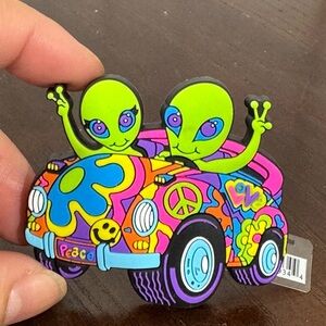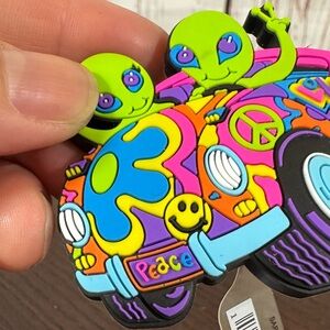 Bring fun and playful appeal with this vibrant Alien Peace Car Jibbitz. Featuring a colorful design with green aliens, it's perfect for imaginative peace loving hippie loving crocs loving individual
