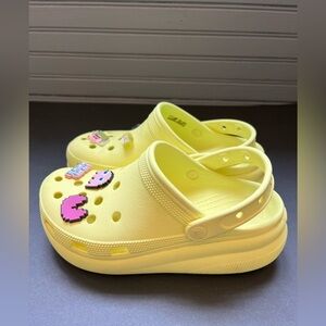 Experience the perfect blend of comfort and style with these yellow CROCS sandals, featuring a platform sole for added height. Made from the classic rubber/foam material, they offer a perforated upper and adjustable heel strap for a secure fit. The playful decorative charms add a unique touch to these vibrant sandals.